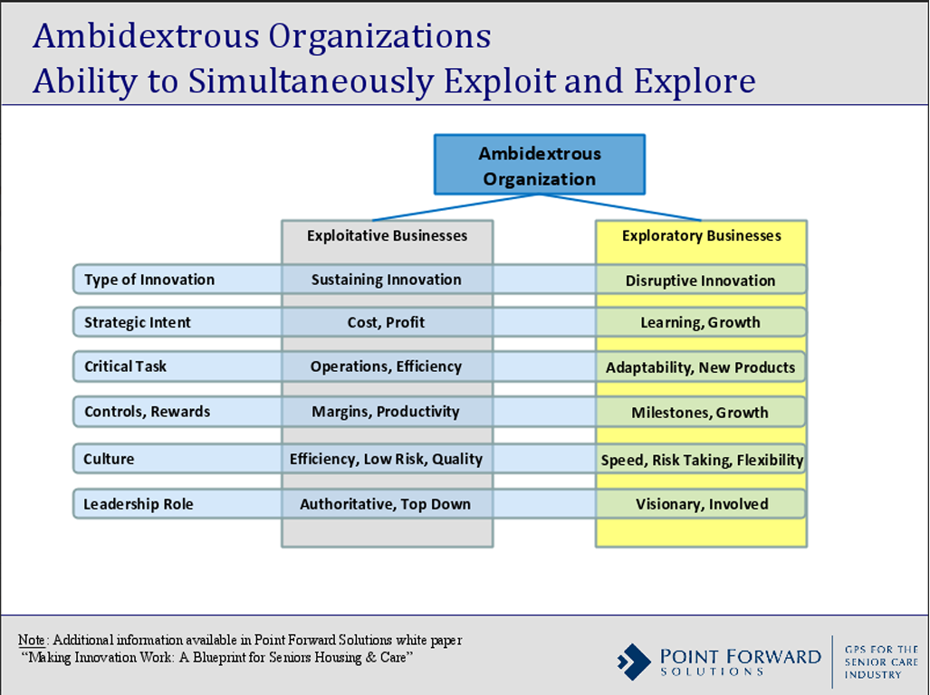 “Today I would argue that some of us may be developing walkmen and iPods in a world waiting for iPhones,” said Ryan Frederick, CEO of Smart Living 360, addressing the 2015 Senior Living Innovation Forum. He emphasized the need for senior living organizations to become “ambidextrous” by not only exploiting their current business prospects, but also developing “competencies to explore new opportunities.”